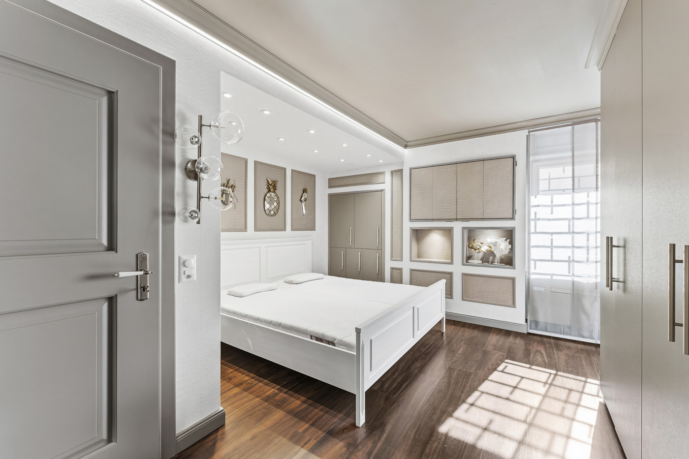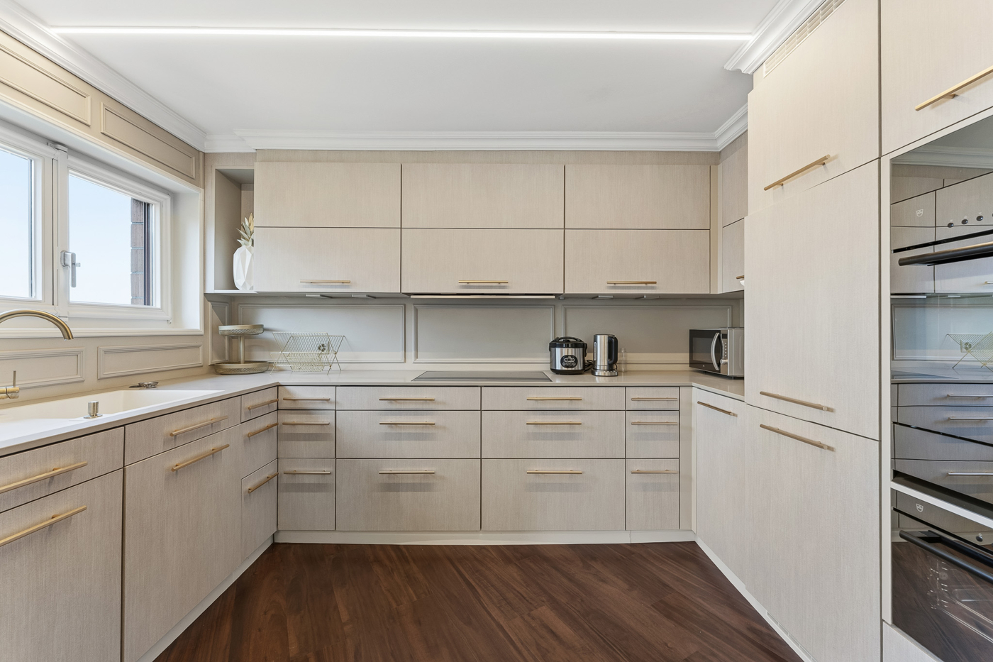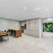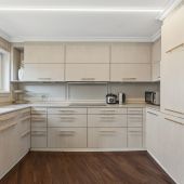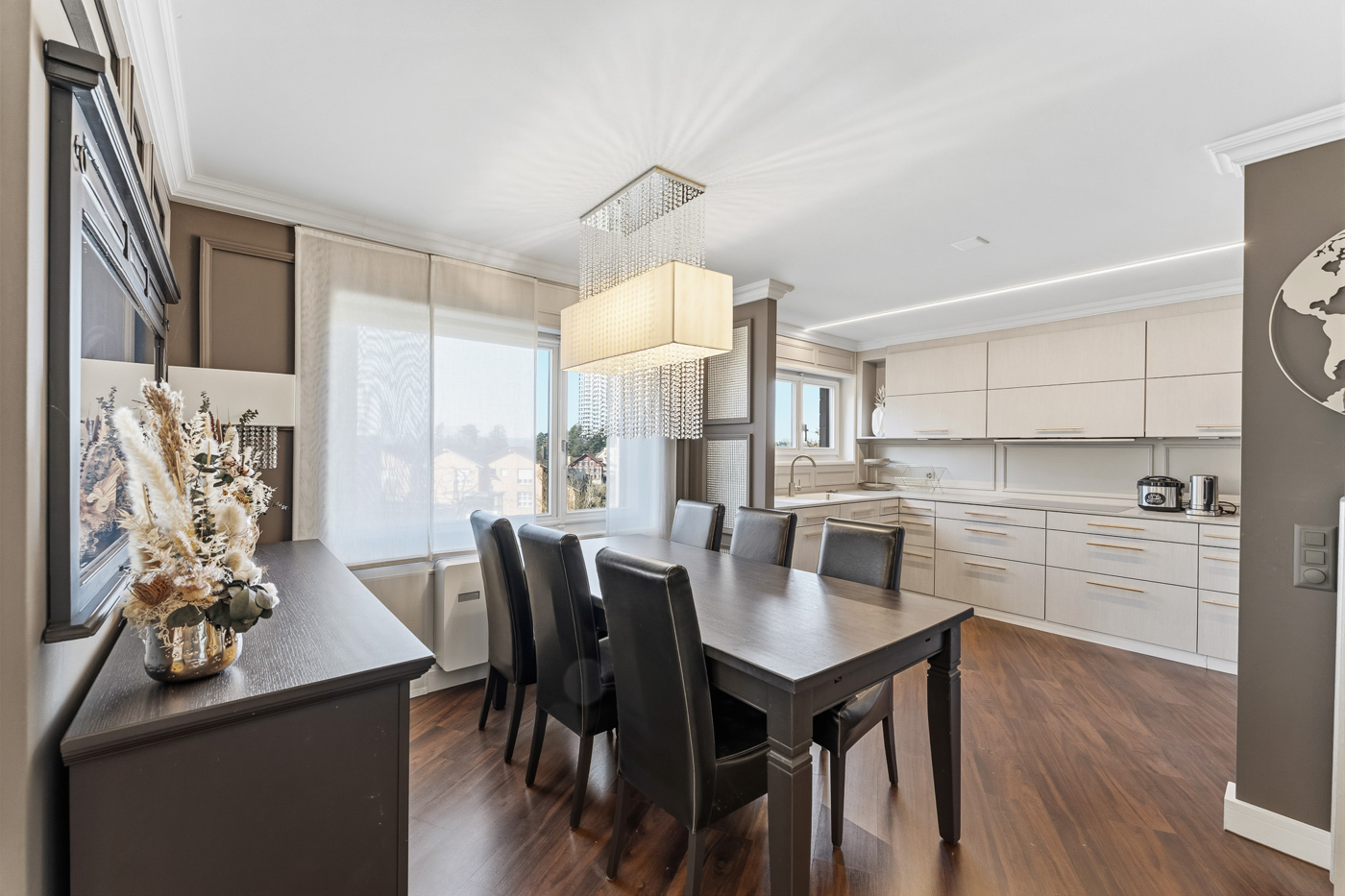 Die moderne Küche ist funktional ausgestattet und ideal in den Wohnbereich integriert. Drei weitere Zimmer bieten vielseitige Nutzungsmöglichkeiten als Schlaf-, Kinder-, Arbeits- oder Gästezimmer.